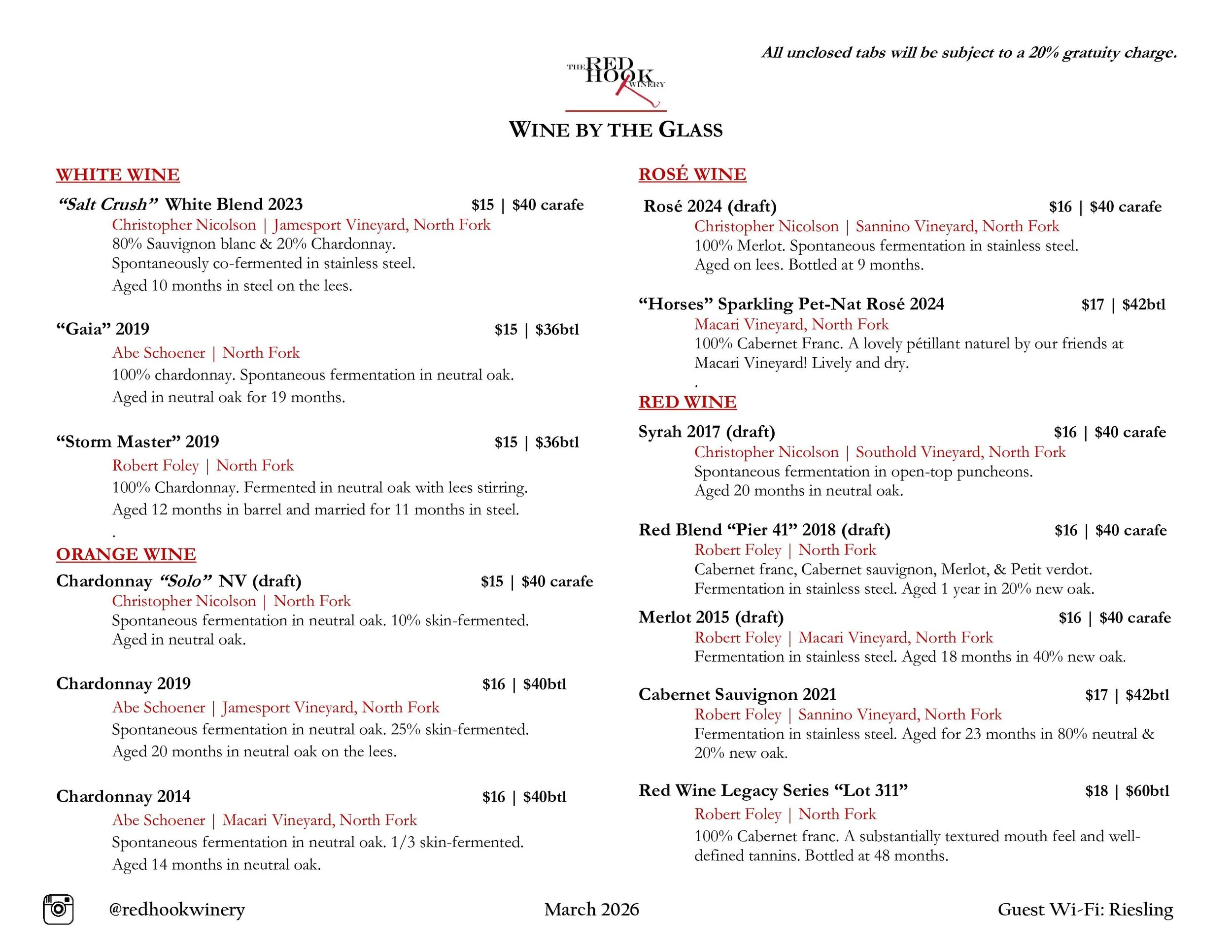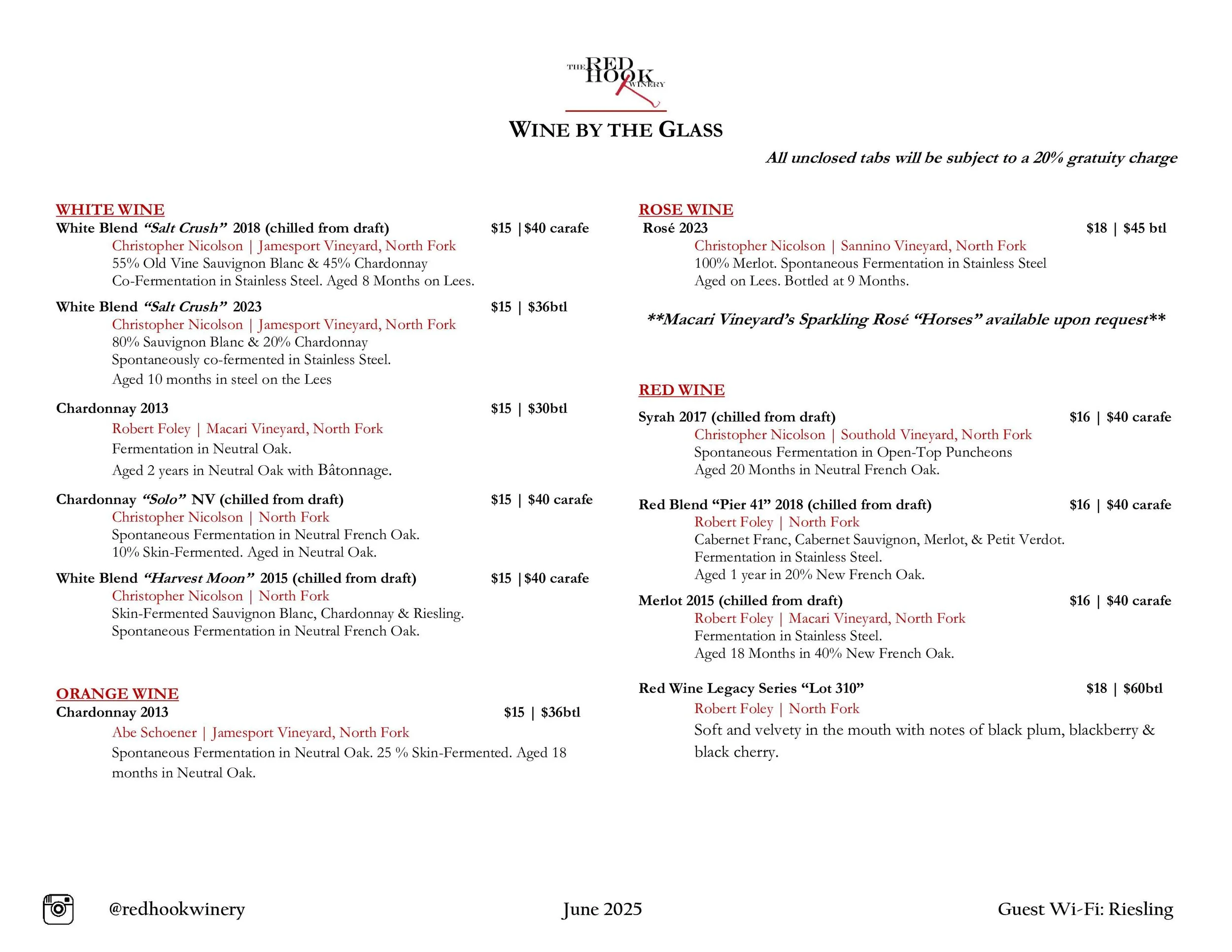 An informative, interactive winery and barrel room tour! You will be able to see first hand all of our wine making, aging, and bottling equipment, while receiving additional information about the history of Red Hook, our winery, and winemakers. The tour will also include two different barrel/tank pulls of wines currently aging in our facility!
